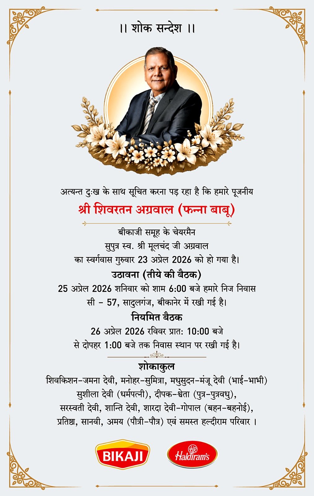 पूर्व मुख्यमंत्री गहलोत ने कहा कि शिवरतन अग्रवाल ने अपने नेतृत्व में Bikaji Foods International को नई ऊंचाइयों तक पहुंचाया और बीकानेर का नाम राष्ट्रीय व अंतरराष्ट्रीय स्तर पर स्थापित किया। उनके सामाजिक सरोकारों और परोपकारी कार्यों को भी लंबे समय तक याद किया जाएगा।
