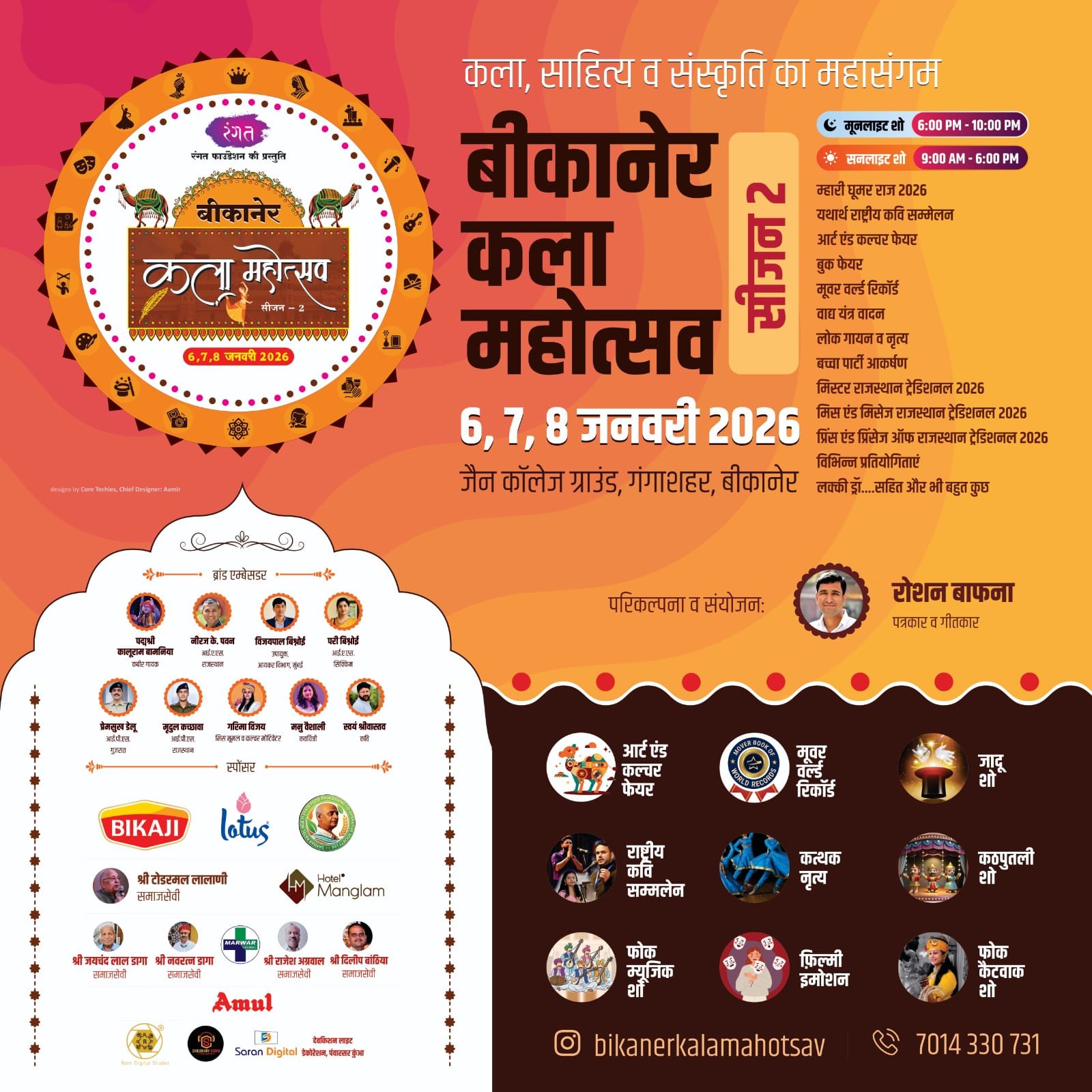 बीकानेर कला महोत्सव: आज शाम 4:30 बजे होंगे कठपुतली, जादू, प्रिंस एंड प्रिंसेज ऑफ राजस्थान जैसे बच्चों के विशेष शो, कबीर गायक कालूराम बामनिया भी आएंगे, एंट्री रहेगी फ्री, पढ़ें ख़बर