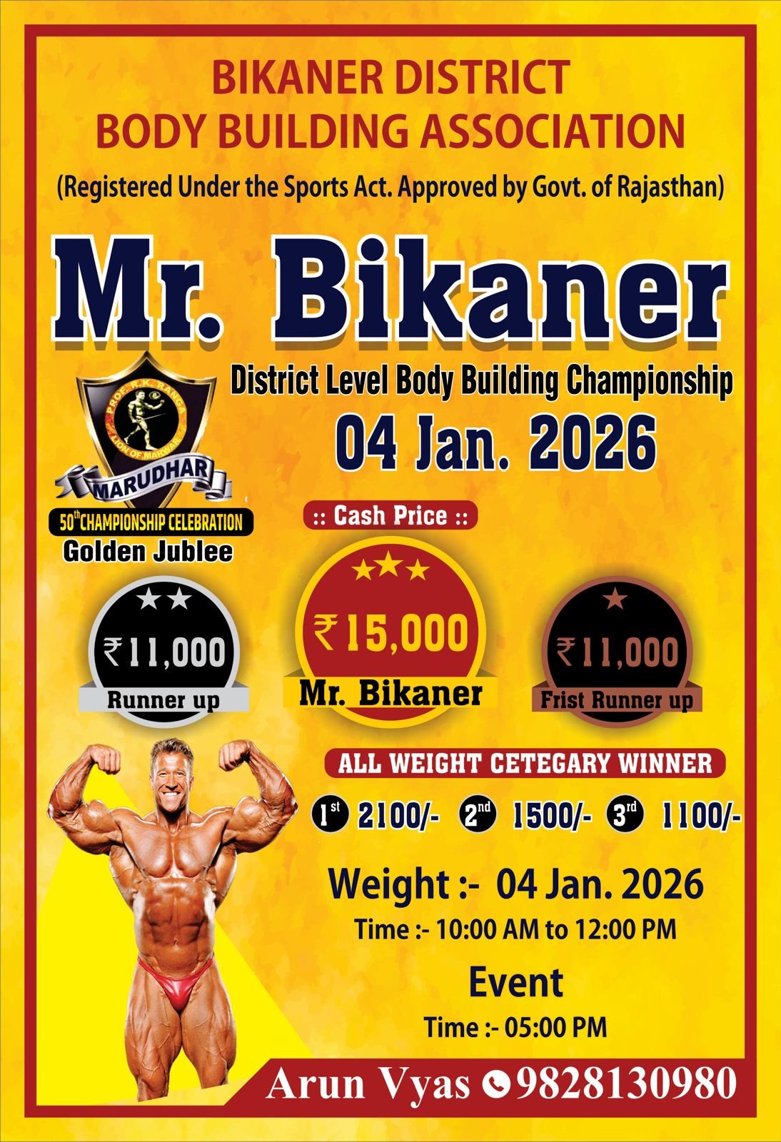 बीकानेर। बीकानेर जिला बॉडी बिल्डिंग संगम और मरुधर जिम्नेजियम के सयुंक्त तत्वाधान में जिला स्तरीय बॉडी बिल्डिंग प्रतियोगिता मि. बीकानेर का आयोजन 4 जनवरी 2026 को स्थानीय हरी हैरिटेज में किया जावेगा | इस अवसर पर जिला संगम के अध्यक्ष अरुण व्यास ने बताया की प्रतियोगिता के प्रमुख ख़िताब मि बीकानेर को ख़िताब क साथ 15000₹ नगद पुरुस्कार, रनर उप को टॉफी व 11000₹, प्रथम रनर उप को भी ट्रॉफी और 11000₹ तथा कुल नौ भार वर्गों में प्रत्येक भार वर्ग के विजेताओं में प्रथम -द्वितीय-तृतीय को क्रमशः 2100₹/1500₹/1100₹ की नगद राशि वितरित की जाएगी, प्रतियोगिता में मि. इण्डिया मो. अशफाक गेस्ट पोजिंग करेंगे | संगम के सचिव आशुतोष स्वामी ने बताया की महिलाओं के लिए भी चैम्पियनशिप होगी, वुमन फिटनेस और पुरुष मास्टर्स प्रतियोगिता में ओपन वेट केटेगरी रहेगी | यह मरुधर जिम द्वारा 50वी प्रतियोगिता आयोजित की जा रही ही जिसे गोल्डन जुबली के रूप में आयोजित किया जा रहा है तथा इस अवसर पर विजेताओं के अतिरिक्त उत्कृष्ट खिलाडियों को मोमेंटो और प्रस्शती पत्र दे कर सम्मानित किया जायेगा तथा प्रतियोगिता में भाग लेने वाले सभी खिलाडियों और जिम संचालको / प्रक्षिशको को भी सम्मानित किया जायेगा |