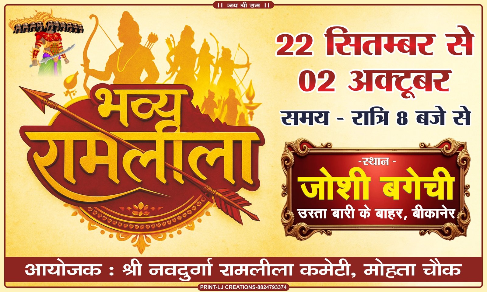 बीकानेर । नवरात्री के शुभ अवसर पर पिछले 2 वर्षो से स्थानीय मोहता चौक के मकराना पिरोल मे होने वाली रामलीला इस बार उस्ता बारी के बाहर जोशी बगेची मे दिनांक 22 सितम्बर से 02 अक्टूबर तक होंगी…
